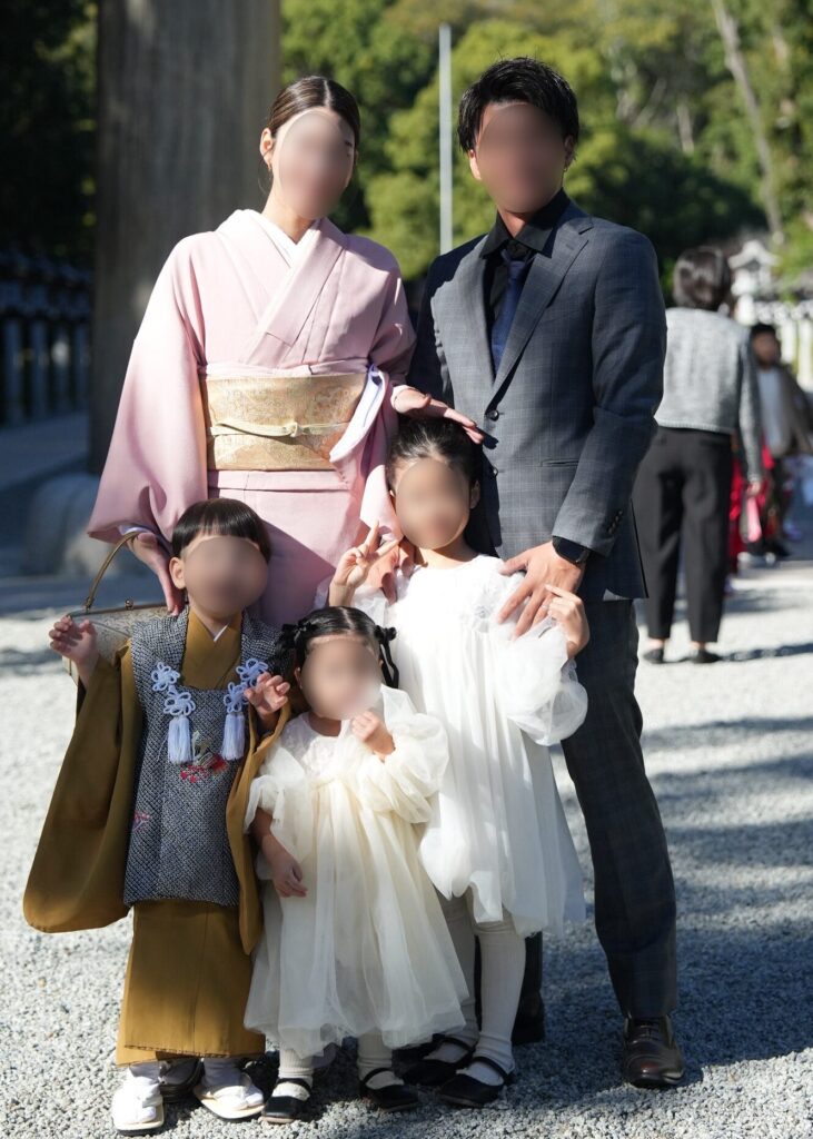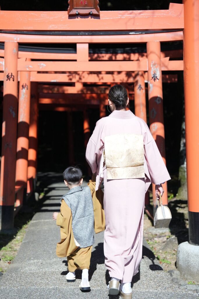 七五三で神社に向かう家族の後ろ姿|訪問着の母親と子供の着物姿(奈良出張着付け)
